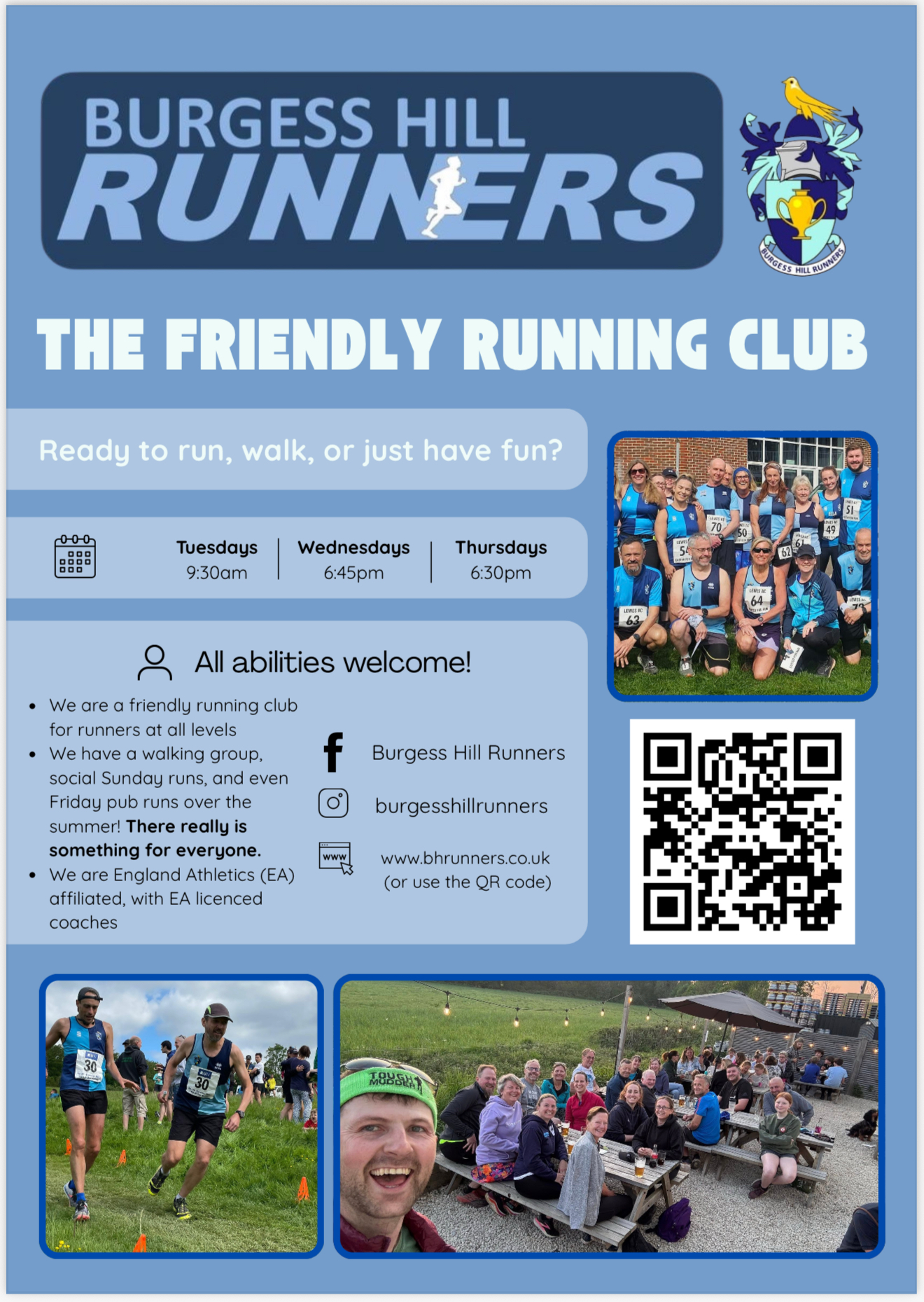 Welcome to the Burgess Hill Runners website. Founded in 1993, we are a friendly running club catering to runners at all levels. Our membership comprises a wide range of running abilities, from those simply wanting to keep fit to those competing in major events. We meet on Wednesday nights at various locations around Burgess Hill and cater for all abilities through our varied Club Sessions.