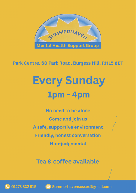 Summerhaven MHSG is a volunteer-run community group and aims to provide a safe space and to help prevent social isolation and stigmatisation. It has received funding from West Sussex County Council, Mid Sussex DC and Burgess Hill District Lions.