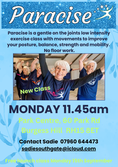Paracise is a gentle on the joints, low intensity exercise class with movements to improve your posture, balance, strength and mobility NO floor work.