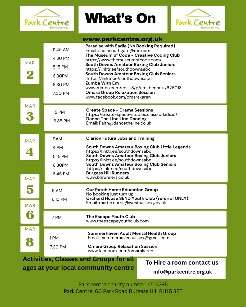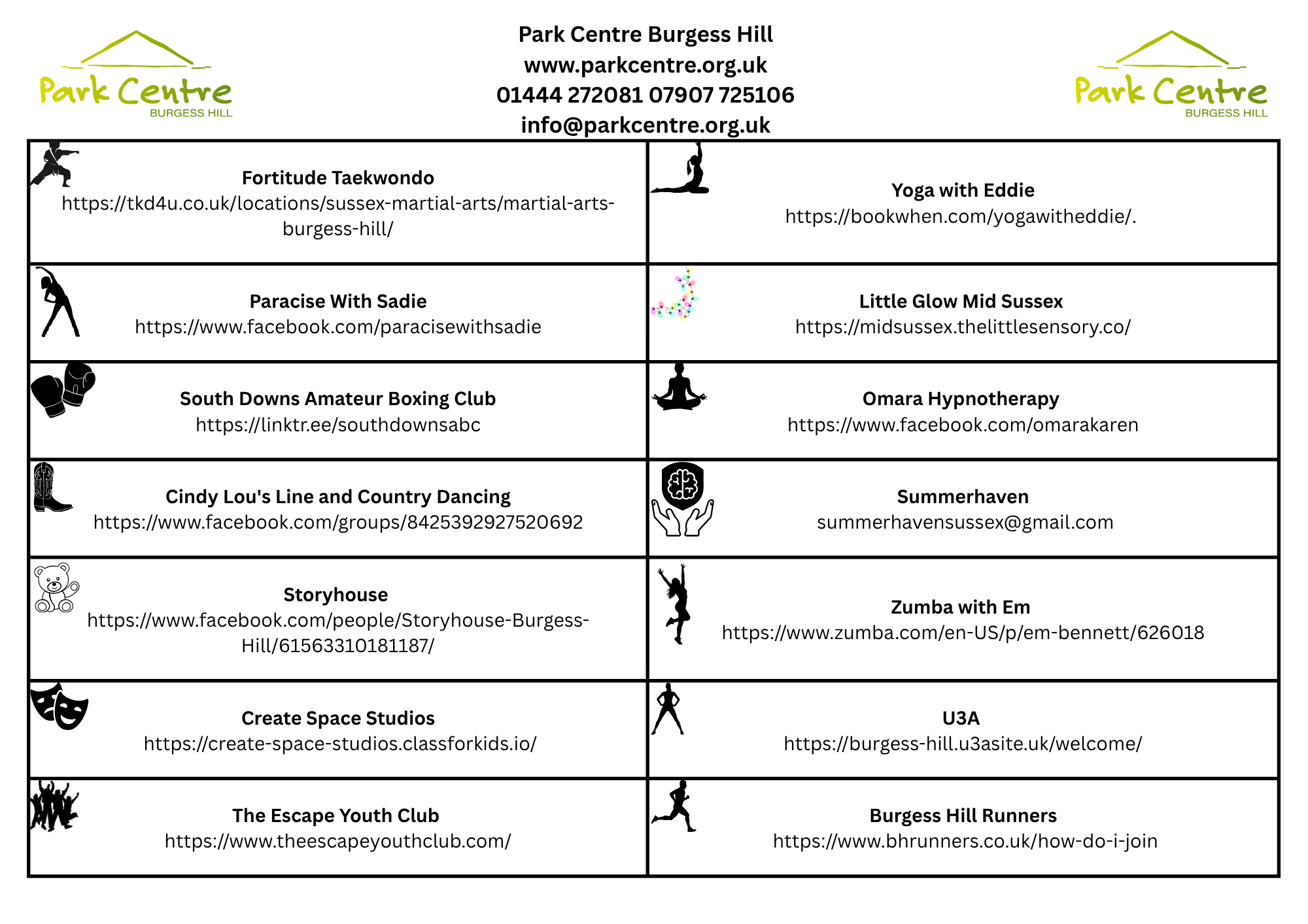 We have a range of activities at Park Centre in Burgess Hill for all ages.