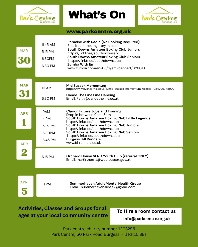 Subscribe to our newsletter, and follow our social media pages for up-to-date information on activities and events at Park Centre in Burgess Hill.