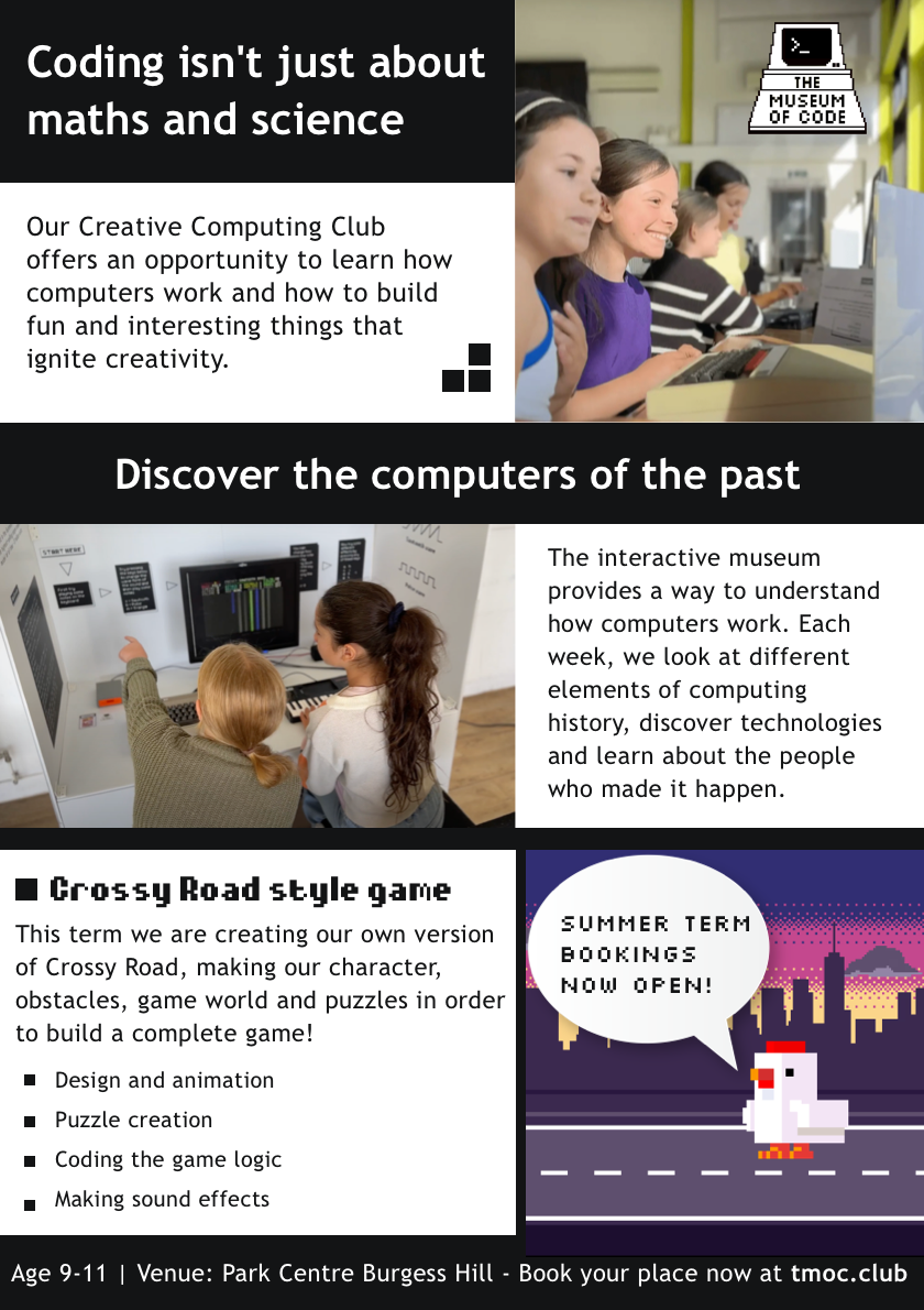 Our museum provides a way to understand how computers from past worked. Each week, we look at different elements of computing history, discover technologies and learn about the people who made it happen. Then we get to try it all out ourselves!We transport children back to a time when computers were, in some ways, simpler to understand. We leverage the constraints of these older systems to foster new ways of thinking.